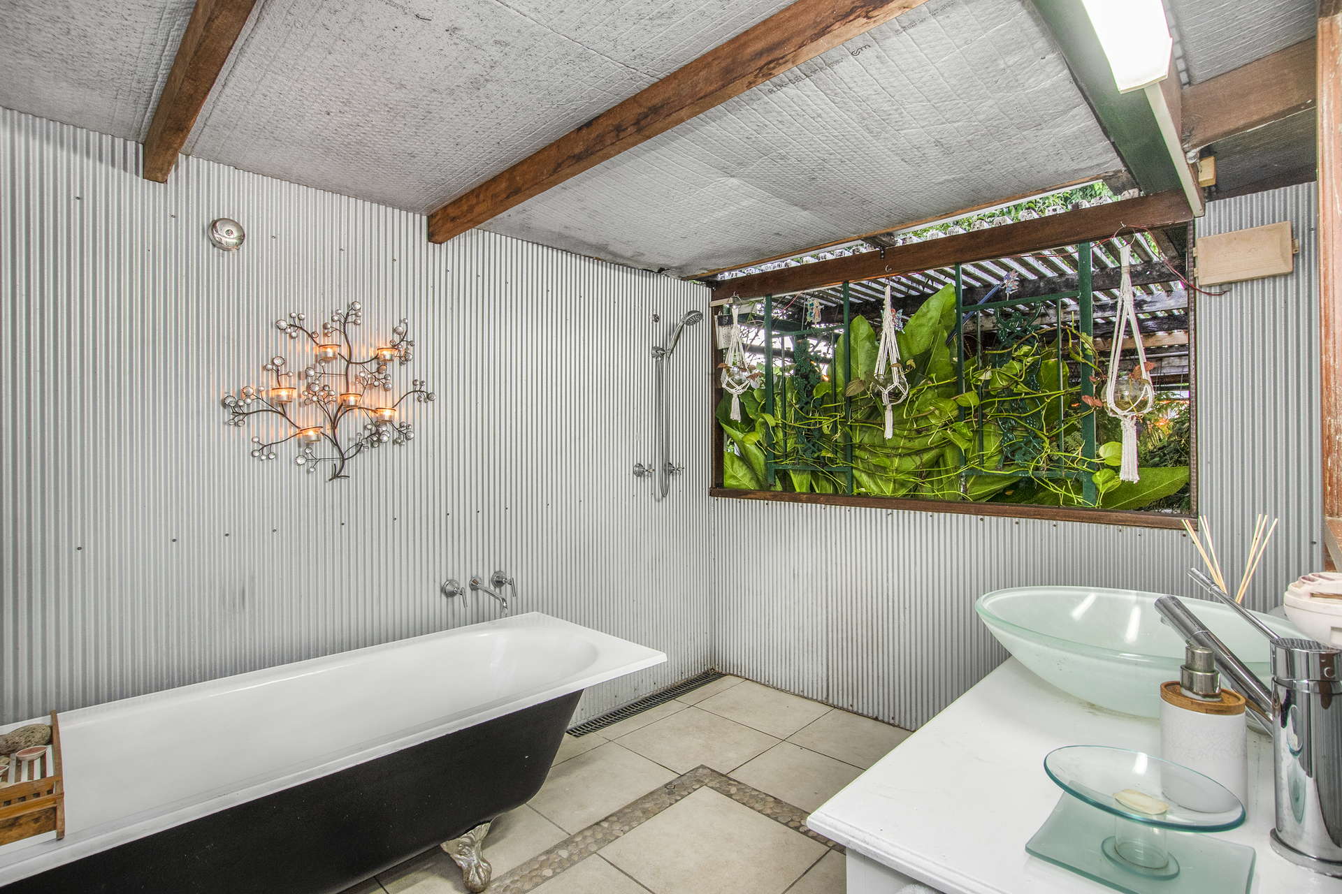 - The 2nd bathroom features claw foot bath and vanity from the era and is surrounded by lush tropical indoor gardens.